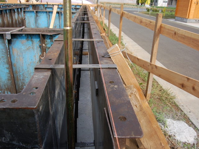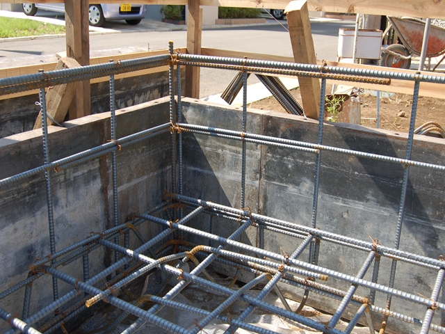 ベタ基礎部が終わると今度は立上り部にパネルを取付けコンクリートを流し込みます。 最終点検としてホールダウン金物のアンカーボルト・基礎の通りを確認します。