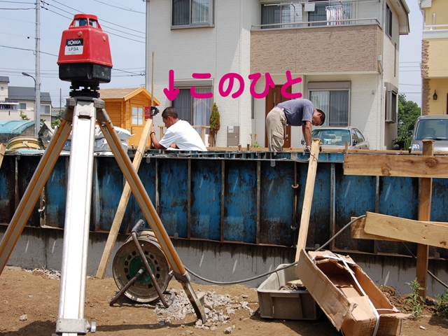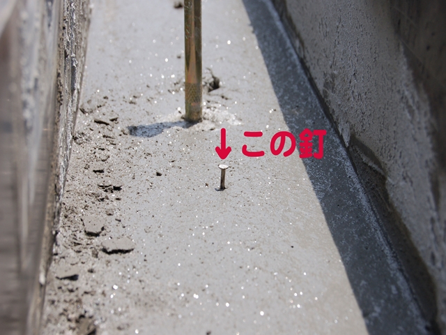 「この人」が「この釘」を調整してました。 「この釘」が最終的な基礎の高さです。 ここに合わせて仕上げ用のコンクリートを流します。