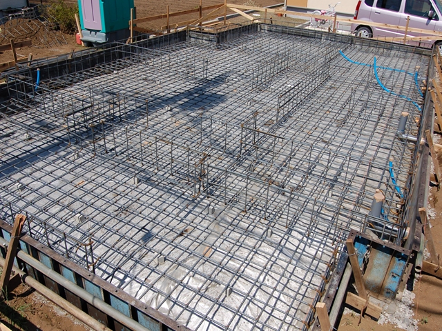 図面通りに行われているかチェック! 【基礎仕様】 ○上端筋D13、下端筋D13 ○縦筋D10@200 ○基礎幅150 ○スラブ筋D13@150(縦横共) ○立上り高:スラブ上端+350mm(GL+400mm) ※検査や法令よりゆとりをもった基礎仕様です。