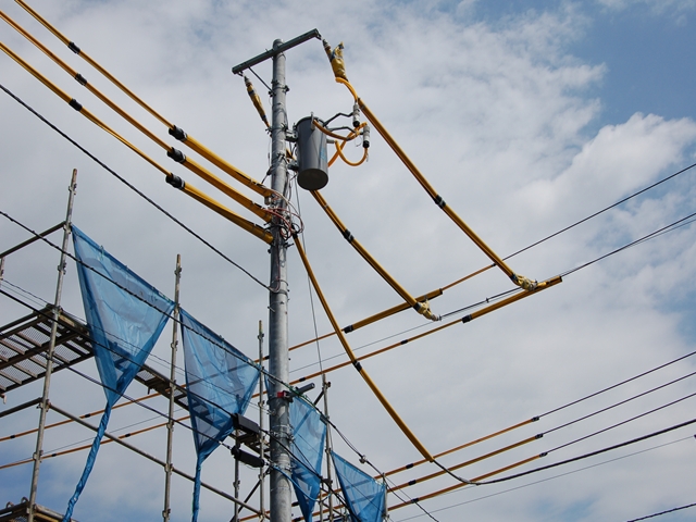 柱が建ったらレッカーで梁を吊り上げます。 電線の上からの作業となったので通常より大きいレッカー車で行いました。