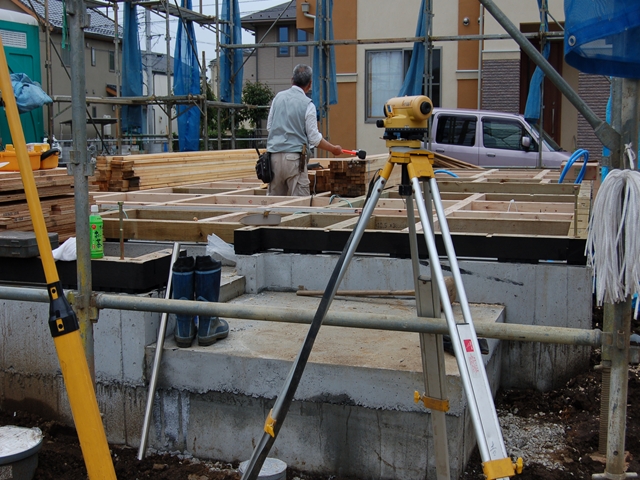 いくら慎重に基礎を作っても若干の誤差は生じます。 そのためコチラもオートレベルで水平を確認し微調整します。