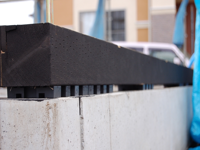 【基礎パッキン】 キソパッキング工法は「キソパッキン」を基礎と土台の間に一定のルールに基づき設置する工法です。 基礎と土台を絶縁することで住まいの耐久性を高め、床下全域の湿気を排湿できる良好な床下環境をつくることで断熱材の性能を維持、 さらに土台の腐れを防ぎ、シロアリや腐朽菌を寄せつけない好条件をつくることができます。