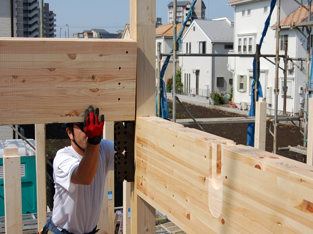 1Fの梁部分(2Fの床)が終わったら金物で接合します。