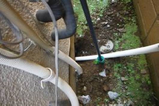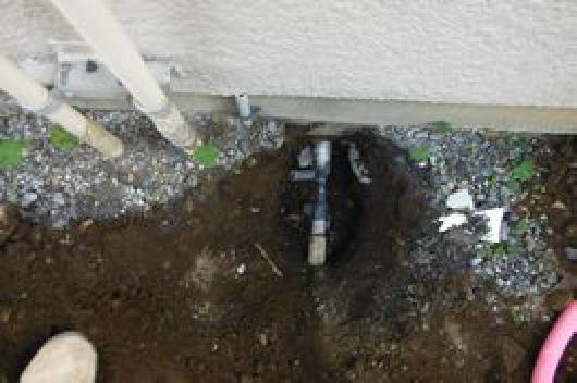 万一の漏水に備え浴室内での配管切り廻しは行わず外部から新規に配管を引き込みます。