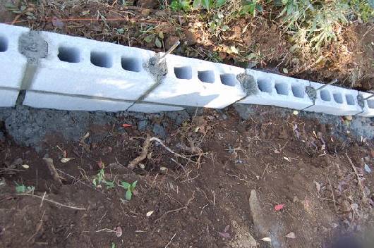 | 工事内容 | 簡単に倒れてしまいそうな境界ブロック施工様子。 |