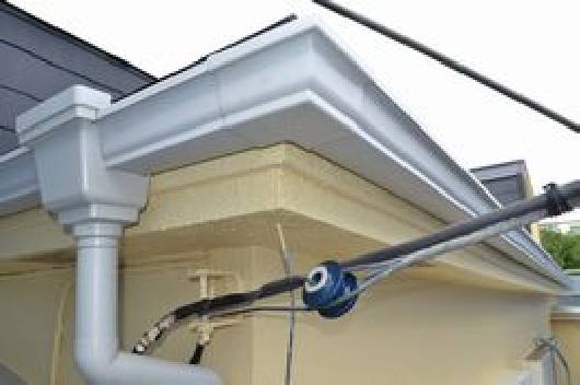 劣化した雨樋は中央でポタポタ雨垂れしたりスムーズに雨水を流す事ができません。今回は形状の違うパナソニック製PC50を取付ました。以前と違い吊金具が見えないので建物がきれいに見えます。