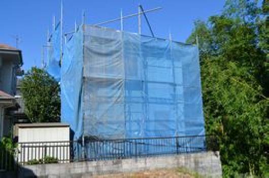 近隣の方へ御迷惑が掛らないように建物をシートで覆います。足場の種類も単管パイプと異なり安全で作業性も良く丁寧な仕事ができる足場です。