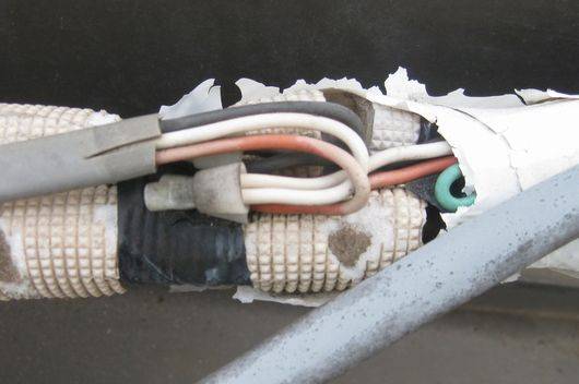 | 工事内容 | エアコンの配管を覆うテープが劣化。このままでは配管の対応年数が短くガス漏れの原因となります。また電気の結線に防水処置が施されていないためとても危険な状態です。 |