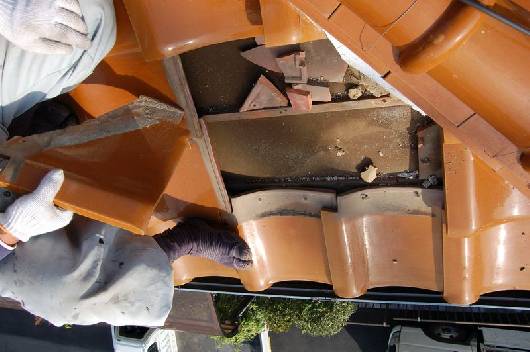 写真1は工事のため棟を外した状態。この棟が付いていないと当然ですが棟の部分より雨漏りします。なぜこの屋根が雨が漏れるかというと屋根の隅部は棟に沿って斜めに切断します。このとき先の尖った部分を切断して雨を下へ逃がしてあげないと屋根材を伝って棟部分より雨漏りしてしまいます。