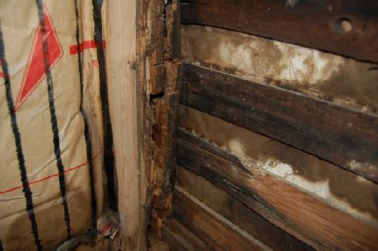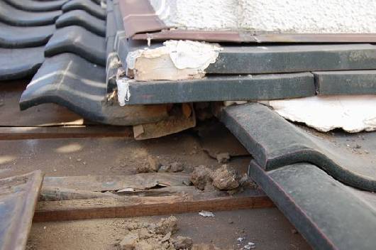 写真2を見て頂くとL形に折れたトタンが見えるかと思います。これは雨が建物に入らないように取付られているステ谷と呼ばれる雨水の逃げ道のような物です。当然ここには雨水が流れるため中に入った水は外に出してあげなければなりません。写真1を見るとどうでしょう?見事に逃げ道が塞がっているのが解ります。ではこの水はどこへ流れていたのかというと屋根の下を通り壁の中へ・・・という事です。対策としては腐食した柱はもちろん、ステ谷を延長し雨水が外へ排出されるようにする必要があります。